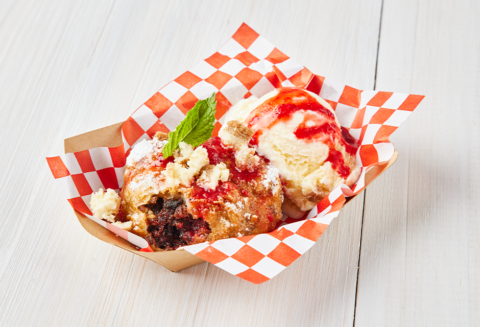 Man cannot live by bread alone – he must have peanut butter. Peanut Butter Paradise starts with deep-frying a honey bun. Then, caramel is injected into the honey bun and then topped with creamy peanut butter. The treat is then layered with some fan-favorite peanut butter treats, Reese’s Pieces, Crushed Butterfinger crumbles, topped off with peanut butter cups, drizzled caramel, and a cloud of powdered sugar. Just another day in paradise!