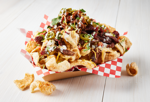 Fresh pork rinds are fried to a golden crispy crunch and then seasoned with just the right number of Cajun-style seasonings to insure a mouthwatering kick. Next, smoked beef fajita meat is spread all over the crispy nachos and covered with delectable freshly made queso. To make this an explosion of flavor, these chicharron nachos are topped with a full serving of savory barbeque chopped beef.