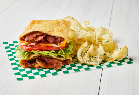 Crunch into the simple pleasure of the Deep Fried BLT! Crispy bacon is folded into a 12” tortilla along with a heaping pile of shredded cheddar cheese to bind all the corners. The rectangle-shaped tortilla gets dunked into the deep fryer, just long enough to get a golden-brown crunch and a melted bliss of cheddar and bacon. Then, the deep-fried goodness is used as the sandwich bread by cutting it in half and layering cool crisp lettuce, two juicy red tomato slices, and mayonnaise in between. To top it off, the fried creation is paired with fresh-cut garlic parmesan chips for a truly notorious B.L.T!