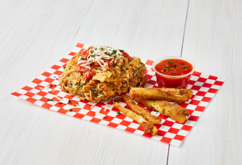 Ribbon pasta is covered with the perfect mixture of ricotta, parmesan, provolone, and fresh mozzarella cheeses, then topped with an amazing homemade meat sauce. Next, more cheese is added and the past is delicately hand-rolled, creating delicious layers of flavor. The lasagna roll is dipped in a cheddar and herb batter and fried golden brown, creating a crispy yet flaky crust. The roll is then garnished with a touch of marinara sauce, mozzarella cheese, and fresh basil, creating a mouthwatering burst of flavor. Served with a side of Deep Fried Zucchini Fries, this dish gives you a taste of Italy with a Texas twist!