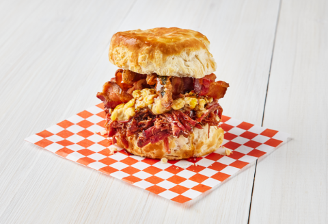 This mouth-watering southern explosion starts with a perfectly cooked golden-brown biscuit. Then, slow-smoked shredded brisket and ladle fire-roasted street corn queso is stacked on top of the biscuit. Then, thick-cut bacon is drizzled with Texas honey with a little bit of kick. The masterpiece is complete when it’s topped off with crispy pickle French fries. Your taste buds will go crazy with the savory-sweet crunchy combination of flavors all in one bite.