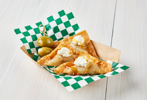 Meats, cheeses, fruits – oh my! Chopped-up fresh mozzarella, salami, and crisp green apples are tossed in olive oil, balsamic vinegar, and Italian herbs. Then the ingredients are wrapped in a wonton wrapper and fried to a golden crisp, topped with creamy goat cheese and a drizzle of hot honey. Everyone’s favorite appetizer rolled into one perfect bite!